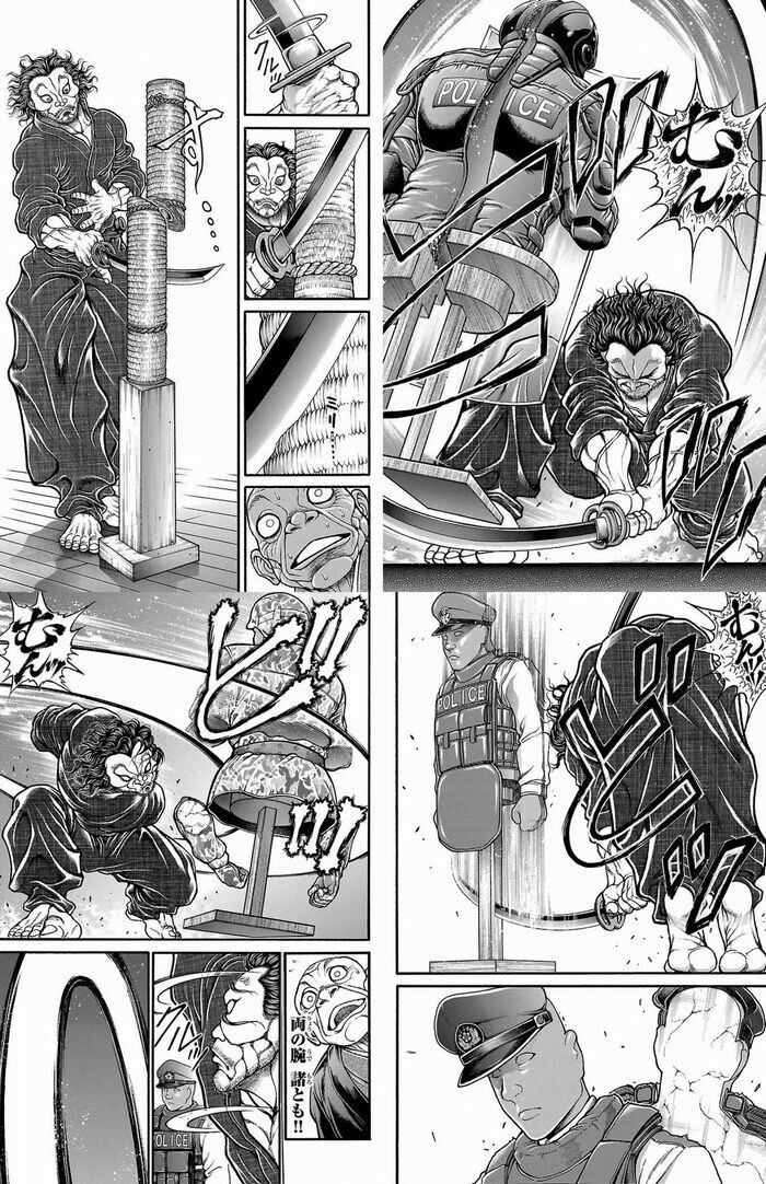 元ネタは宮本武蔵が愛刀「無銘 金重」を手にする御存知『刃牙道』109話の試し斬りパート。ほぼ完全コピーといっていい出来栄えだが、これを手始めに続く話数では武蔵との試合で回転が間に合わず斬られた烈海王、またぞろ会食で中華料理を頬張る烈という強コンボ。